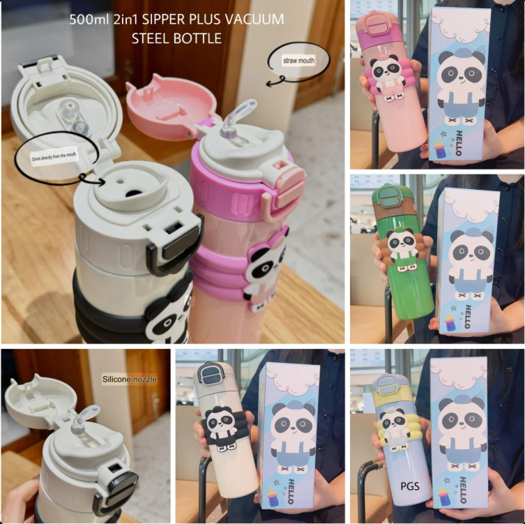 Water Bottle: Round shape, strap, leak-proof, and straw.