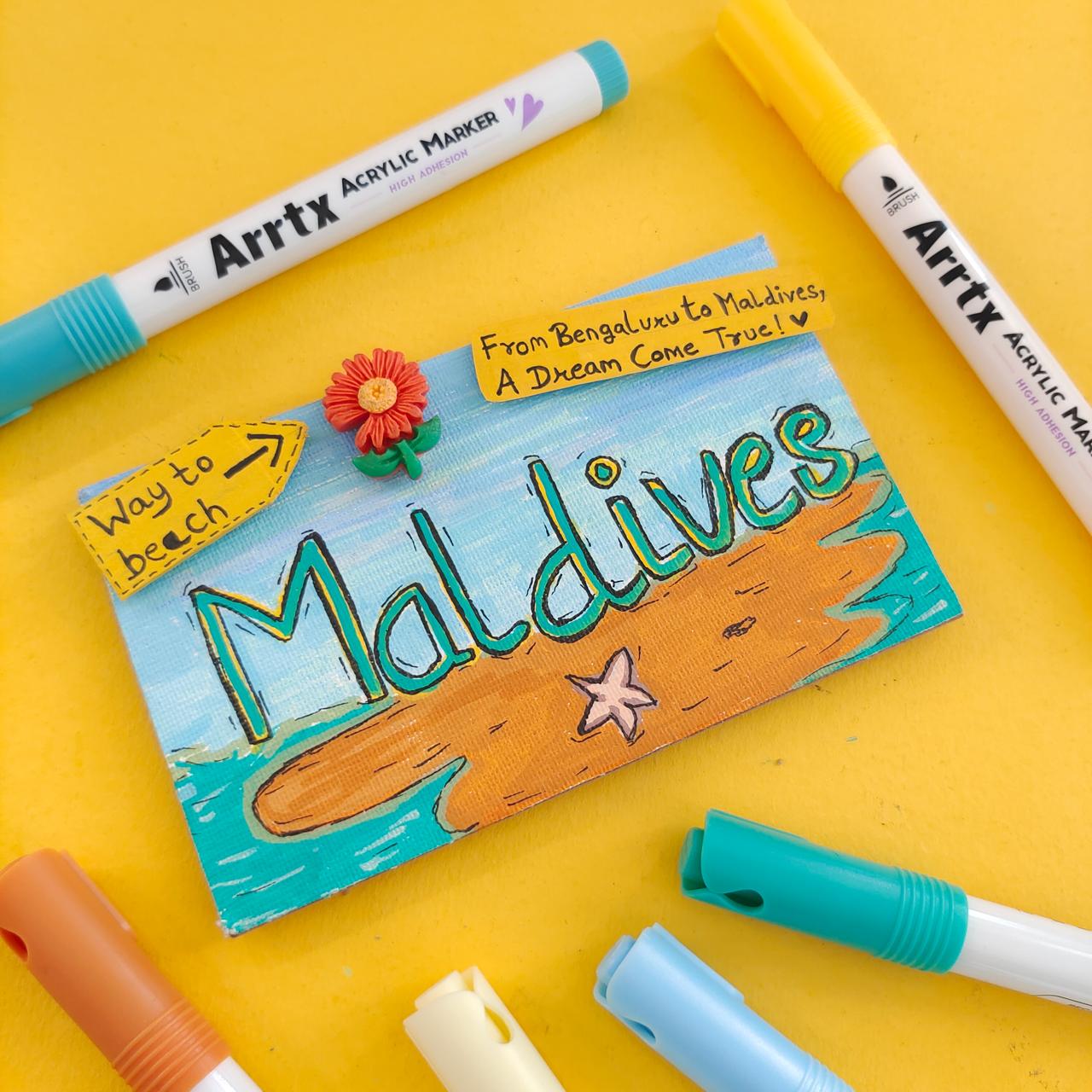 Each element—from the turquoise sea to the playful “Way to beach” sign—is carefully illustrated using Arrtx Acrylic Markers on textured cardstock. Finished with a handcrafted flower detail, this mini canvas makes for a perfect travel keepsake, a thoughtful gift, or a vibrant addition to your desk or wall.